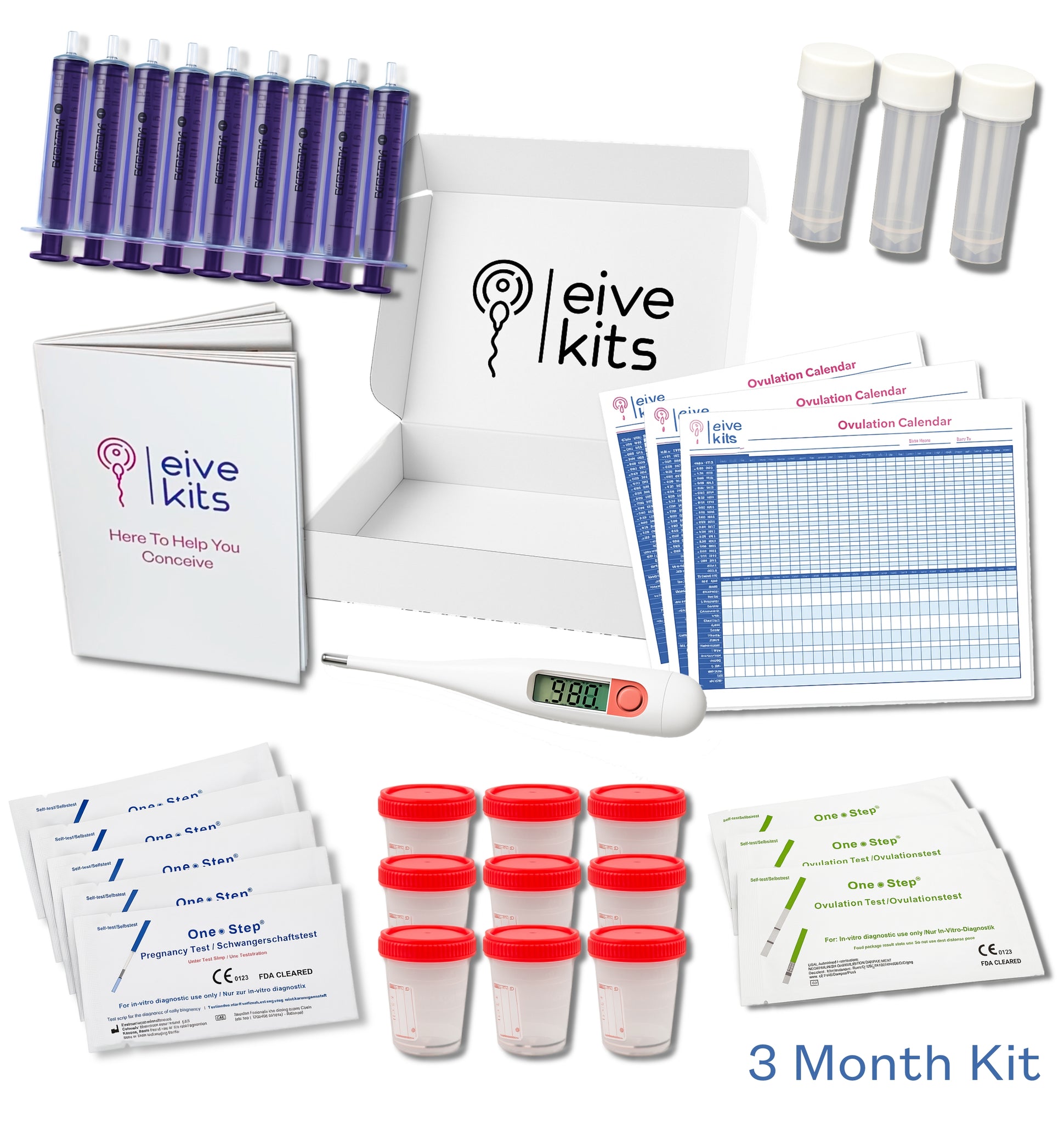 Our 3-Month Starter Kit includes everything required for 3 cycles or 9 insemination attempts, complete with a highly accurate basal body temperature thermometer and chart to monitor your temperature throughout your cycle. The 1-Month Follow-On Kit provides supplies for an additional month of insemination attempts. Both kits contain ovulation strips, pregnancy test strips, specimen cups, syringes, and an information booklet.